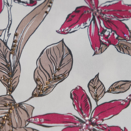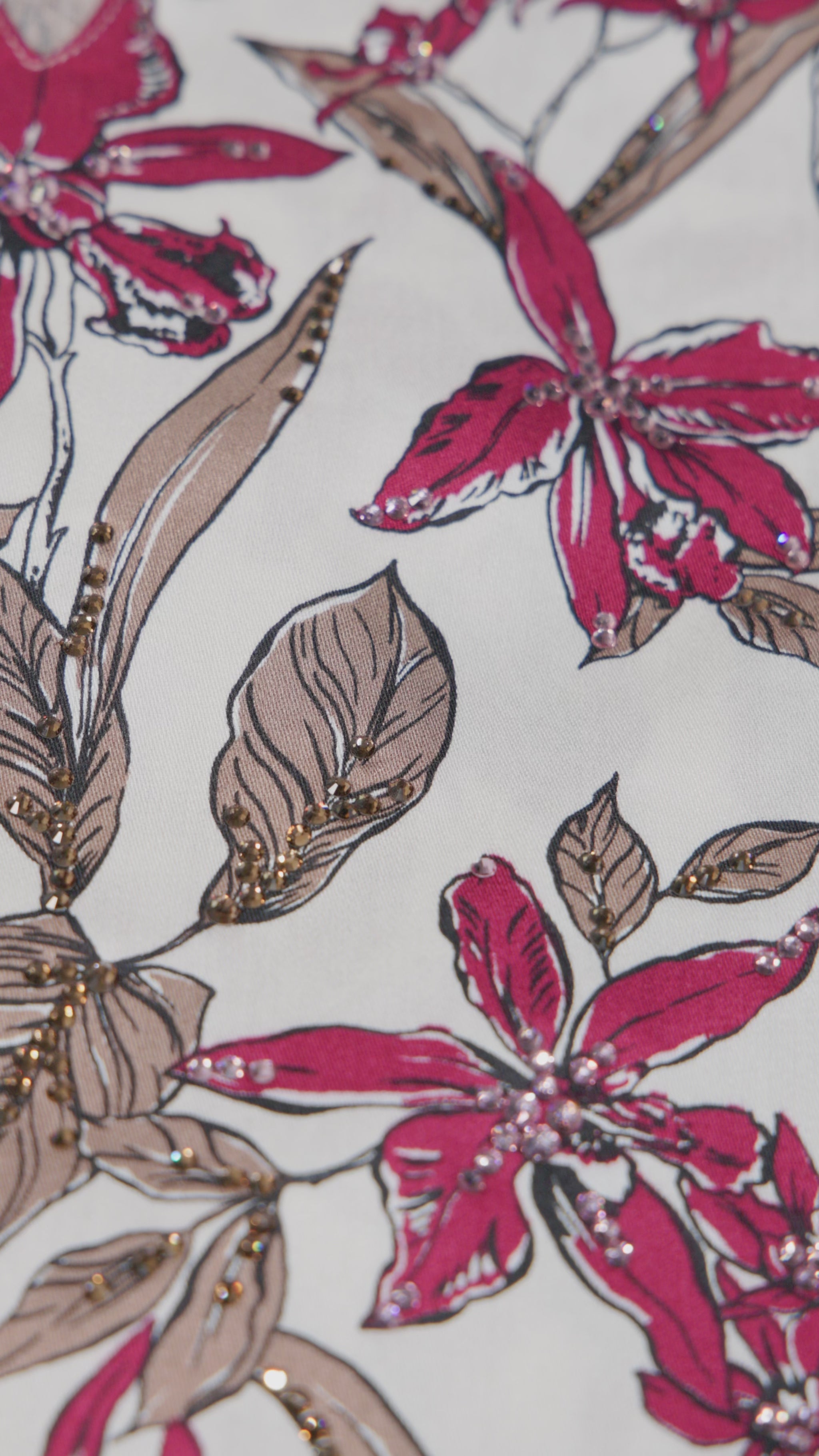 Italian Off white viscose caftan with all over floral prints in Burgundy and Fuchsia features a round neckline with slit opening and long sleeves. The bodice and sleeves are highlighted with hints of smoked topaz and pink European hotfix crystals to lend subtle shimmer.