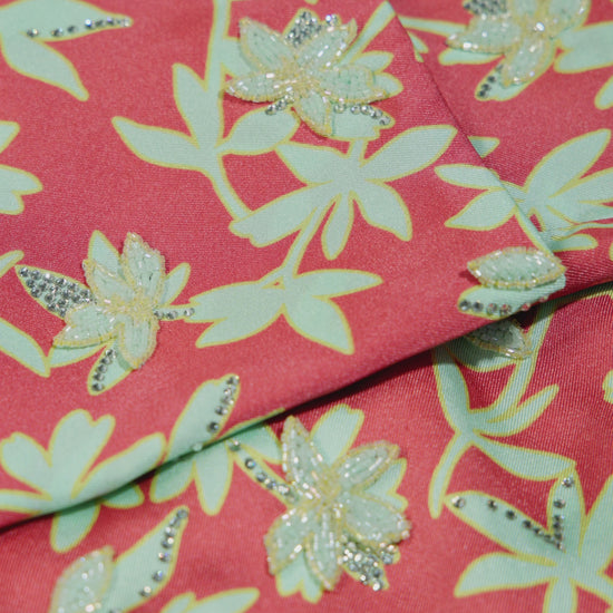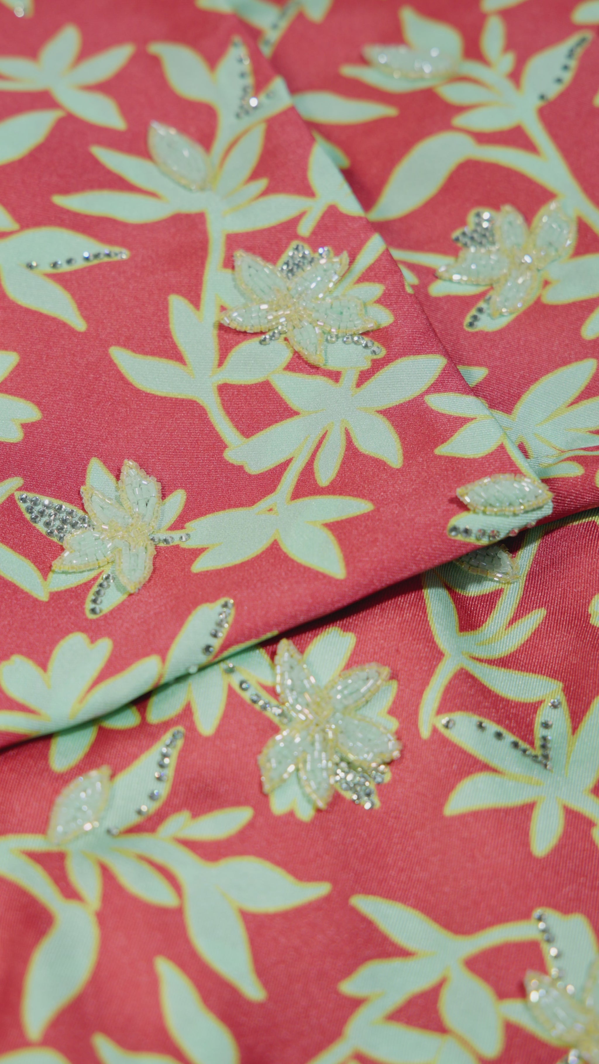 An exquisite Italian Twill caftan in deep crimson adorned with jade ivy motifs and 3D crystal-european embroidered blossoms. Each floral accent is delicately hand-embellished with European hotfix & beads, creating a refined interplay of texture and light. A perfect balance between statement color and timeless sophistication.