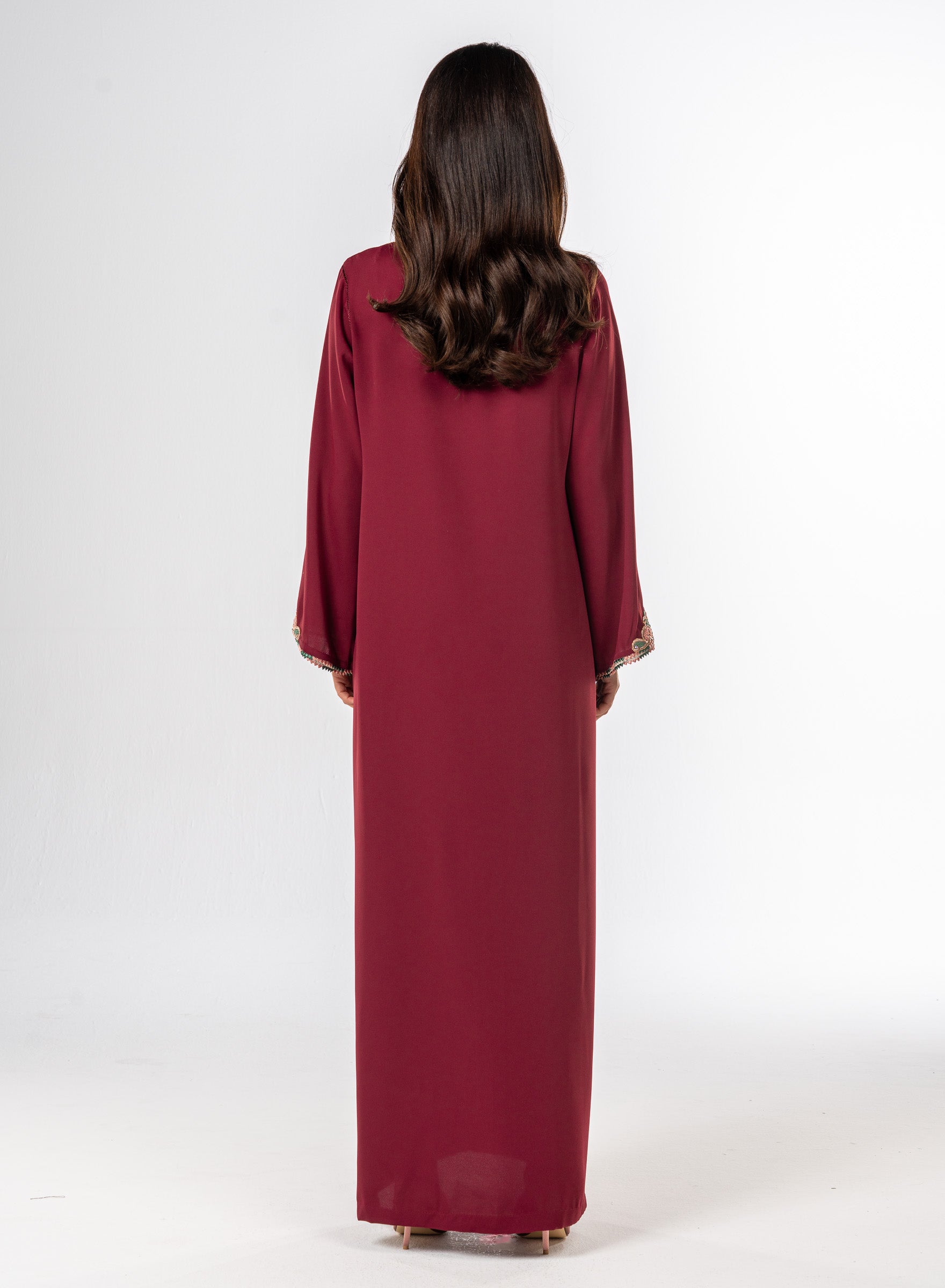 صُنع هذا القفطان المغربي من قماش الكريب البورغندي، ويتميز بانسيابيته الأنيقة وتفاصيله الحرفية الدقيقة. تضفي التطريزات الزهرية ولمسات الكريستال والزخارف المغربية المضفرة عمقًا وجمالًا على التصميم، مما يجعله قطعة أنيقة وراقية، مثالية لجميع المناسبات. صُمم هذا القفطان ليمنحكِ حركة رشيقة وحضورًا أنيقًا، مما يجعله خيارًا مثاليًا للتجمعات العائلية، واستضافة المناسبات، والسهرات.